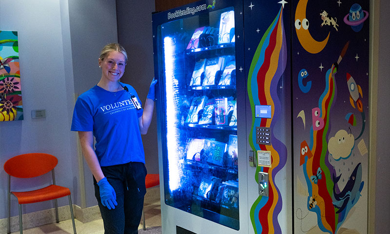 In August 2024, Children’s installed a book vending machine in its Emergency Department. While in the waiting room, children can receive a token to get a book from the machine. It’s a joint effort between the child life and volunteer services teams, and it promotes literacy while giving kids an activity during their wait. Since installation, the hospital has provided more than 5,400 books to families.