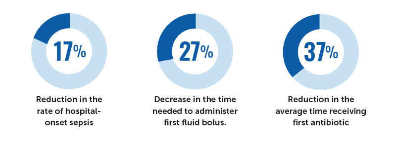 Since 2017, the hospital has improved in three areas: reducing the rate of hospital-onset sepsis cases from 1.24 to 1.03 per 1,000 (17% decrease), cutting the average time to administer the first fluid bolus from 52 minutes to 38 minutes (27% decrease) and driving down the average time to first antibiotic from 116 minutes to 73 minutes (37% decrease).